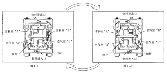 軸桿上固定有兩個膜片,每端一個。當壓縮空氣供至空氣室b(右側,見圖1.1)時,軸桿向右移動,容料室B中的物料被擠出,同時被吸進容料室A中。